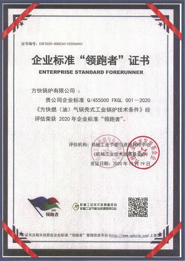 2020 年,方快的“燃(油)氣鍋殼式工業(yè)鍋爐技術(shù)條件”獲得了企業(yè)標(biāo)準(zhǔn)“領(lǐng)跑者”大會(huì)的高度認(rèn)可,成為行業(yè)唯一。