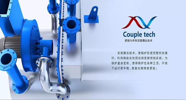 1.鍋爐采用耦合技術, 使鍋爐形成完整的熱循環, 利用梯級余熱回收和變頻燃燒系統, 為鍋爐量身定制, 使得鍋爐在各種工況、環境下運行更平穩, 氮氧化物排放更低;